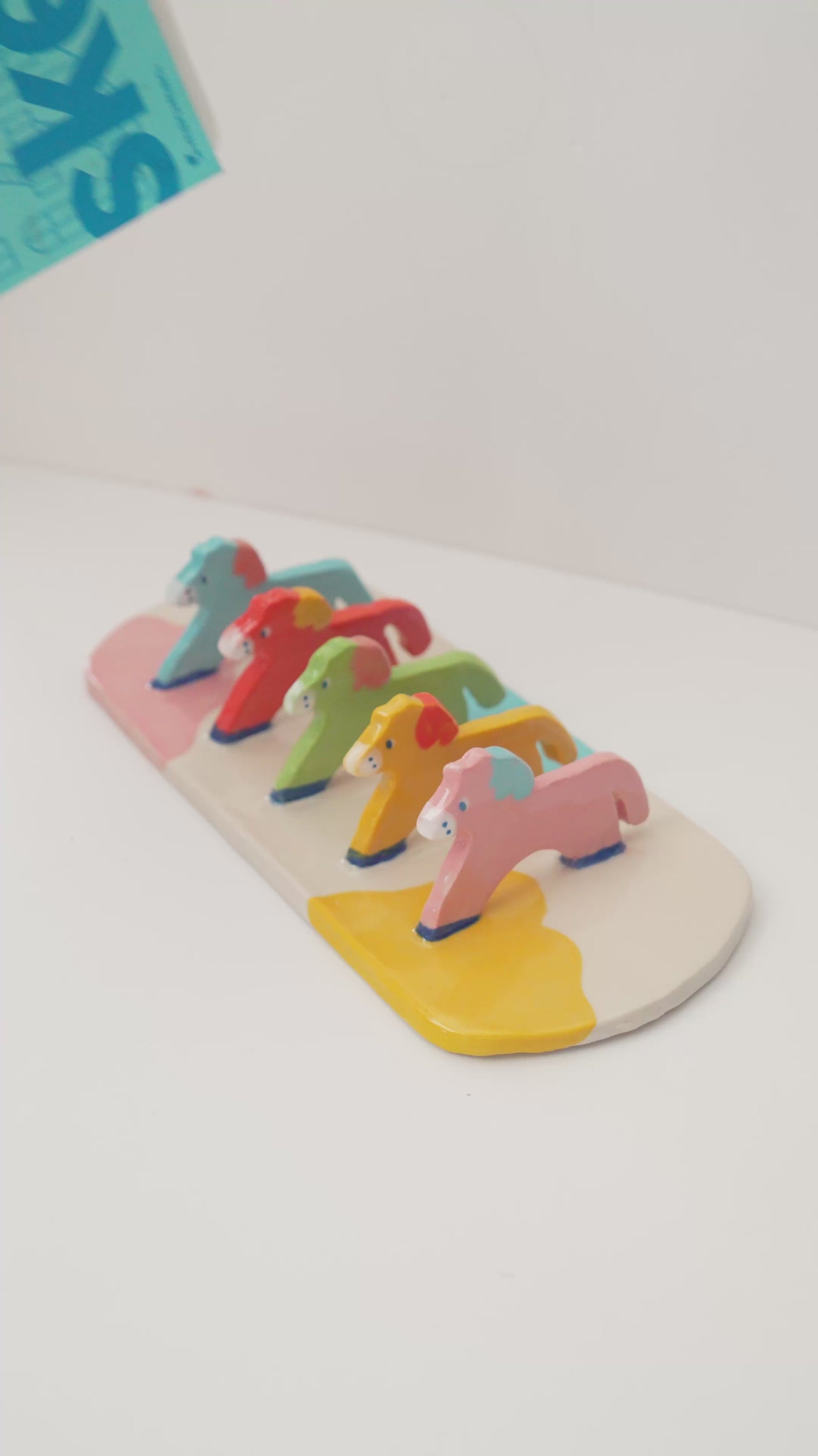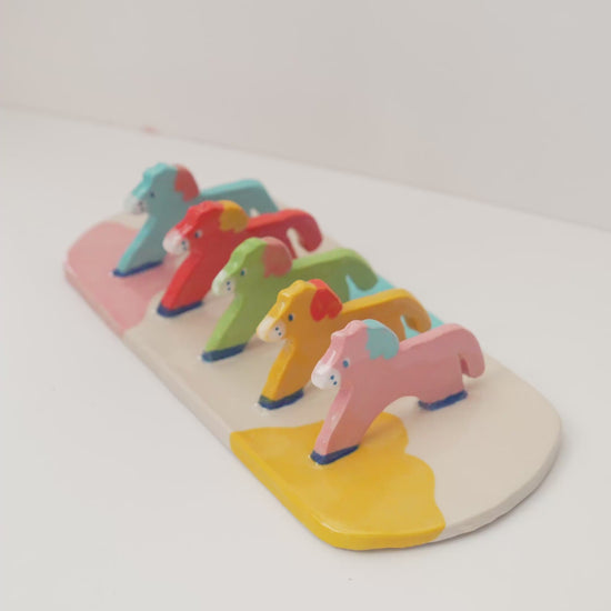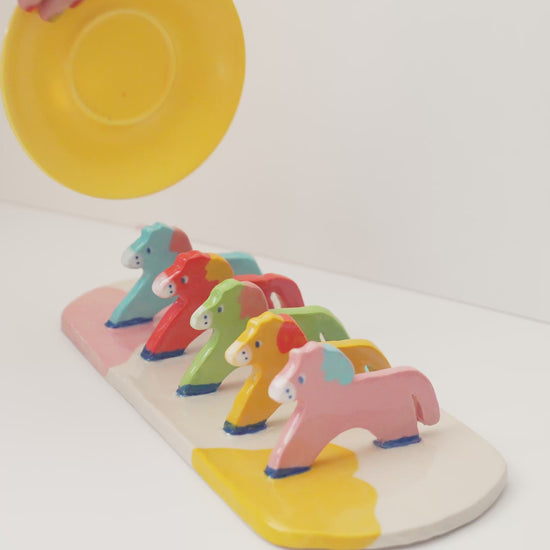 A tiny parade of pastel ponies designed to hold your favorite small plates, dessert plates, or books.